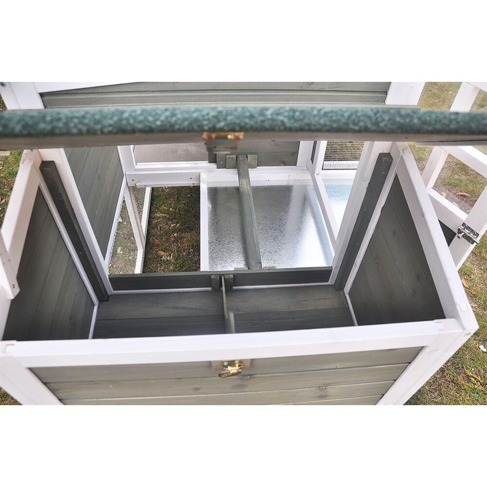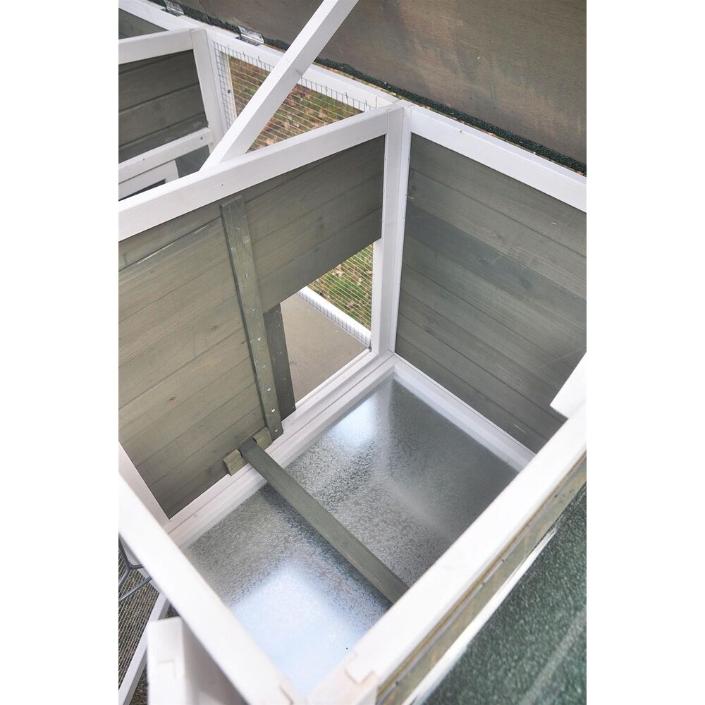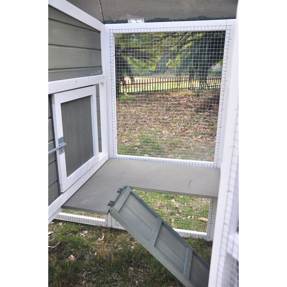 Dzięki zewnętrznemu uchwytowi możesz otwierać luk wybiegu bez wchodzenia do środka. Kury mogą swobodnie korzystać z zadaszonego wybiegu lub bezpiecznie wracać do sypialni po drabince.