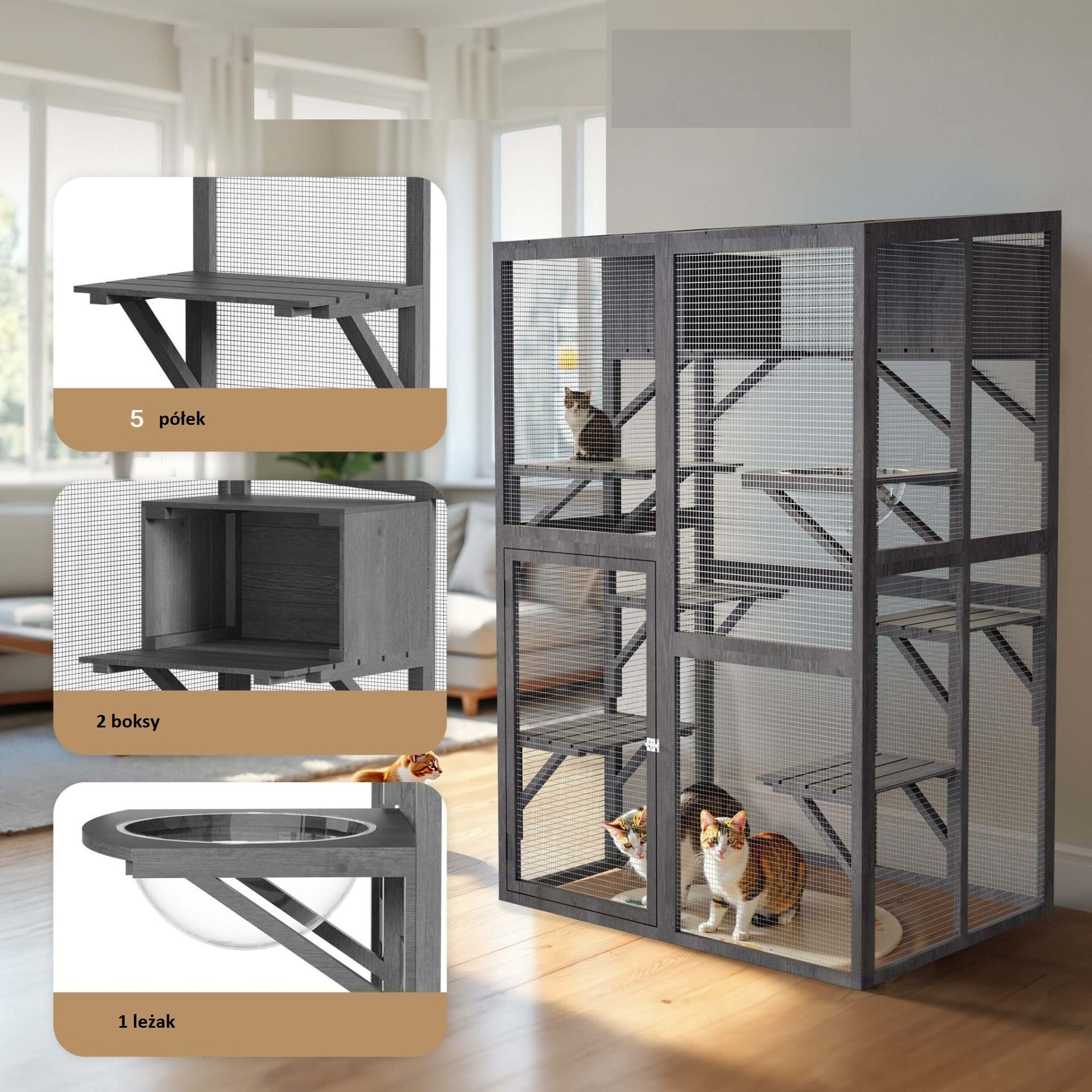 Szkielet woliery wykonany jest z drewnianych zabejcowanych rur, co zapewnia trwałość i estetykę. Siatka polipropylenowa PVC, użyta do jej budowy, jest dostosowana do całorocznego użytku i idealnie nadaje się dla kotów, kur, indyków, świnek morskich oraz kaczek. Klatka jest również doskonałym rozwiązaniem dla innych małych zwierząt, zapewniając im komfort i bezpieczeństwo. Otwierane drzwiczki umożliwiają łatwy dostęp do zwierząt, co czyni codzienną opiekę jeszcze prostszą.