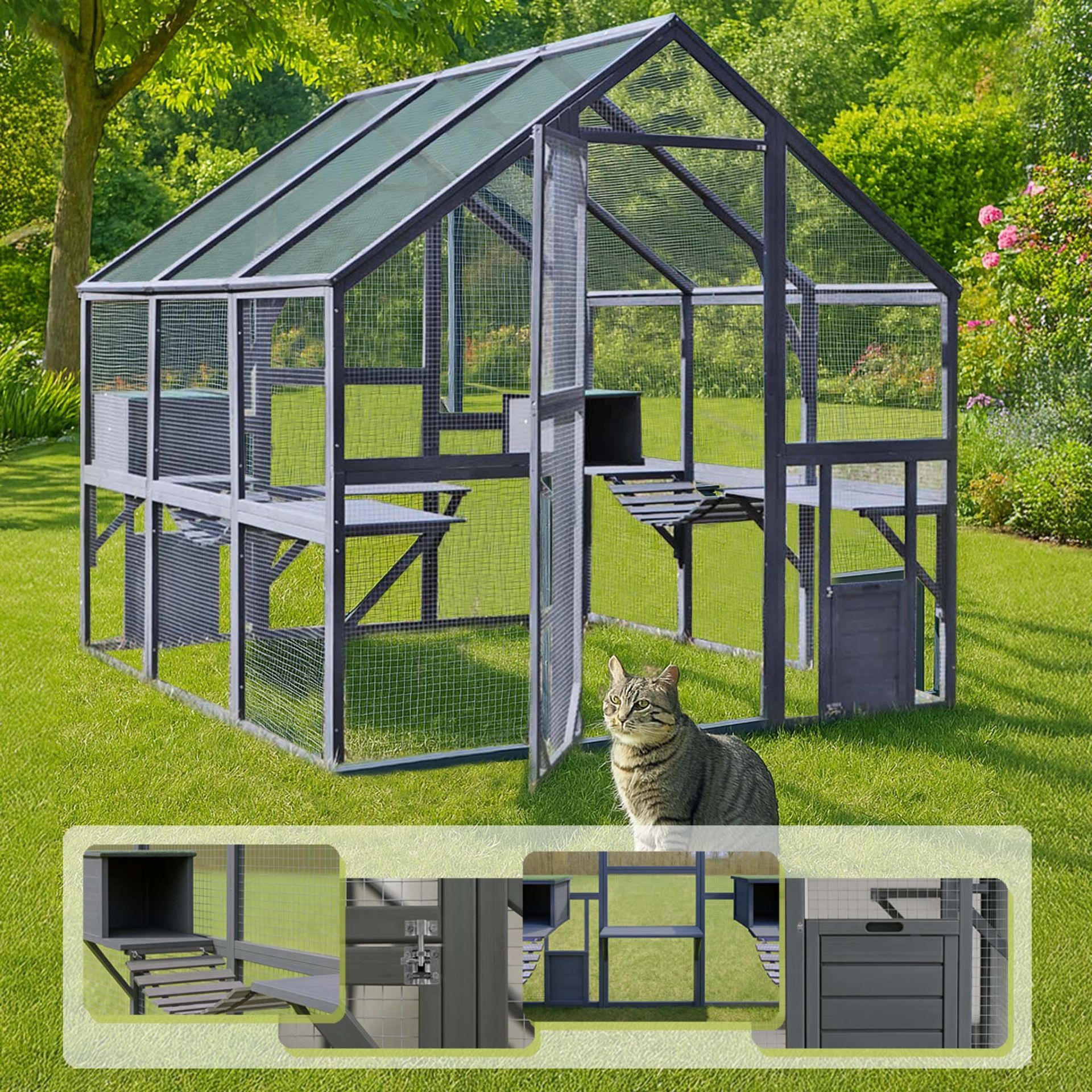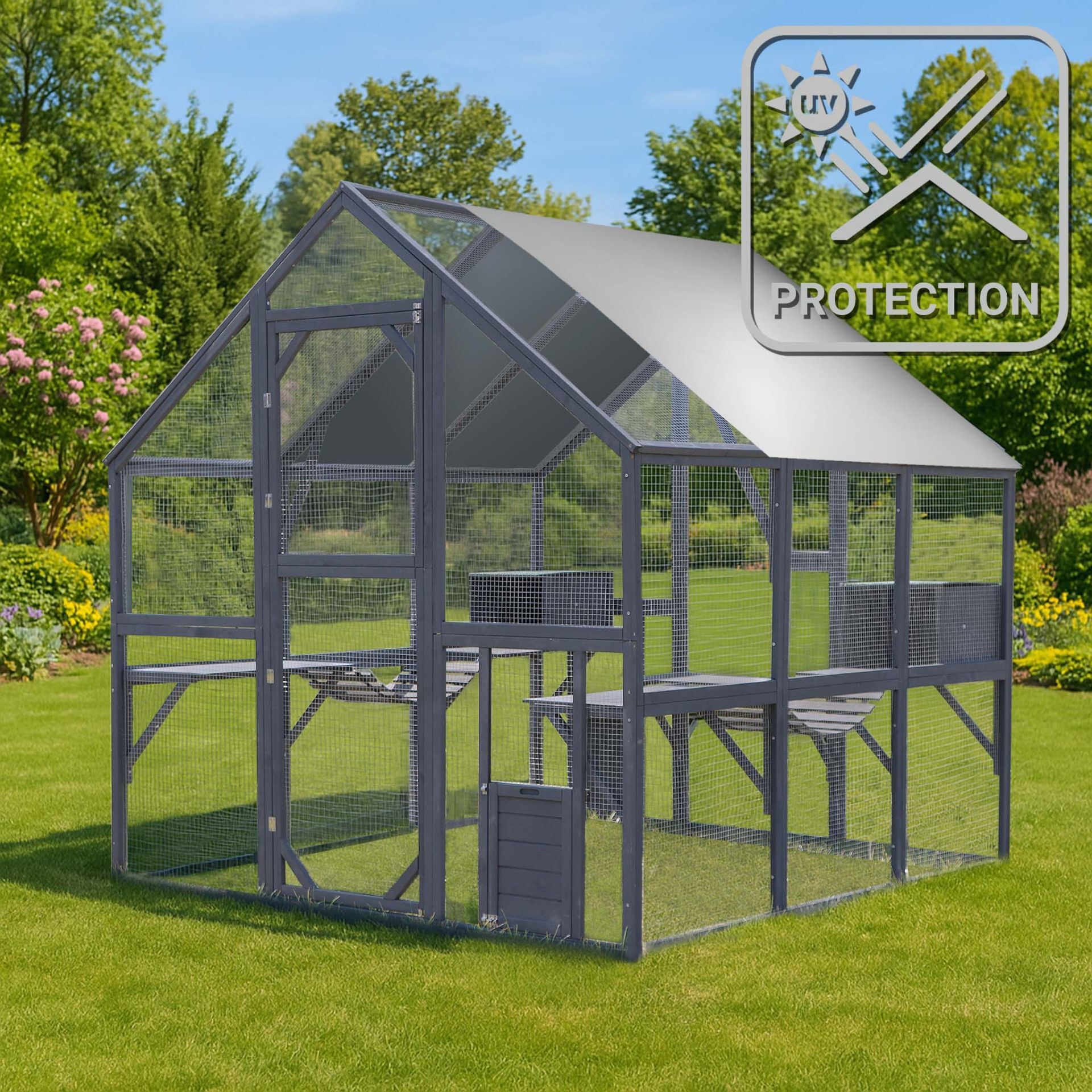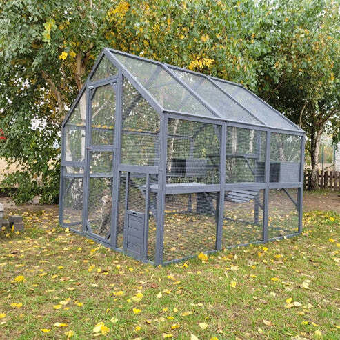 Szkielet woliery wykonany jest z drewnianych zabejcowanych rur, co zapewnia trwałość i estetykę. Siatka polipropylenowa PVC, użyta do jej budowy, jest dostosowana do całorocznego użytku i idealnie nadaje się dla kotów, kur, indyków, świnek morskich oraz kaczek. Klatka jest również doskonałym rozwiązaniem dla innych małych zwierząt, zapewniając im komfort i bezpieczeństwo. Otwierane drzwiczki umożliwiają łatwy dostęp do zwierząt, co czyni codzienną opiekę jeszcze prostszą.