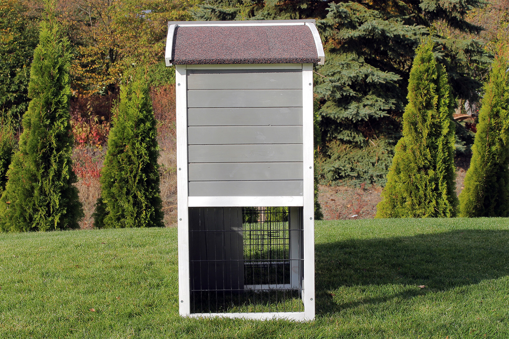 Całoroczne bezpieczeństwo: Możliwość szczelnego oddzielenia poziomów sprawia, że klatka doskonale sprawdza się zimą, chroniąc zwierzęta przed mroźnym wiatrem.