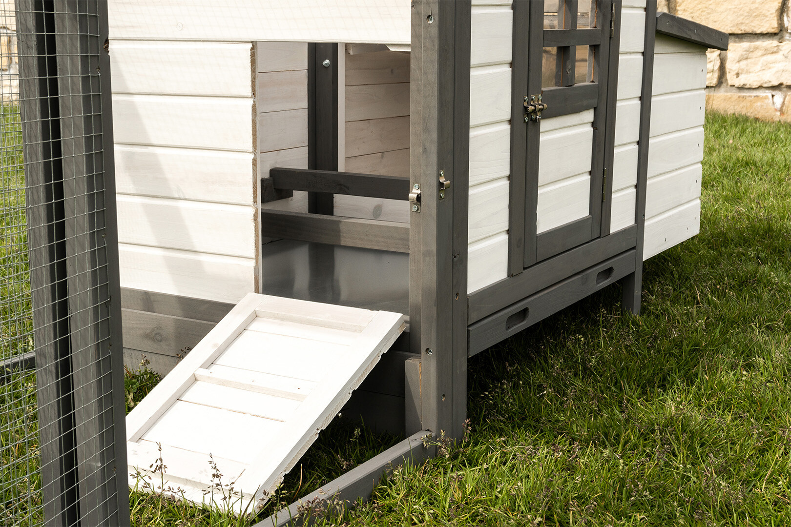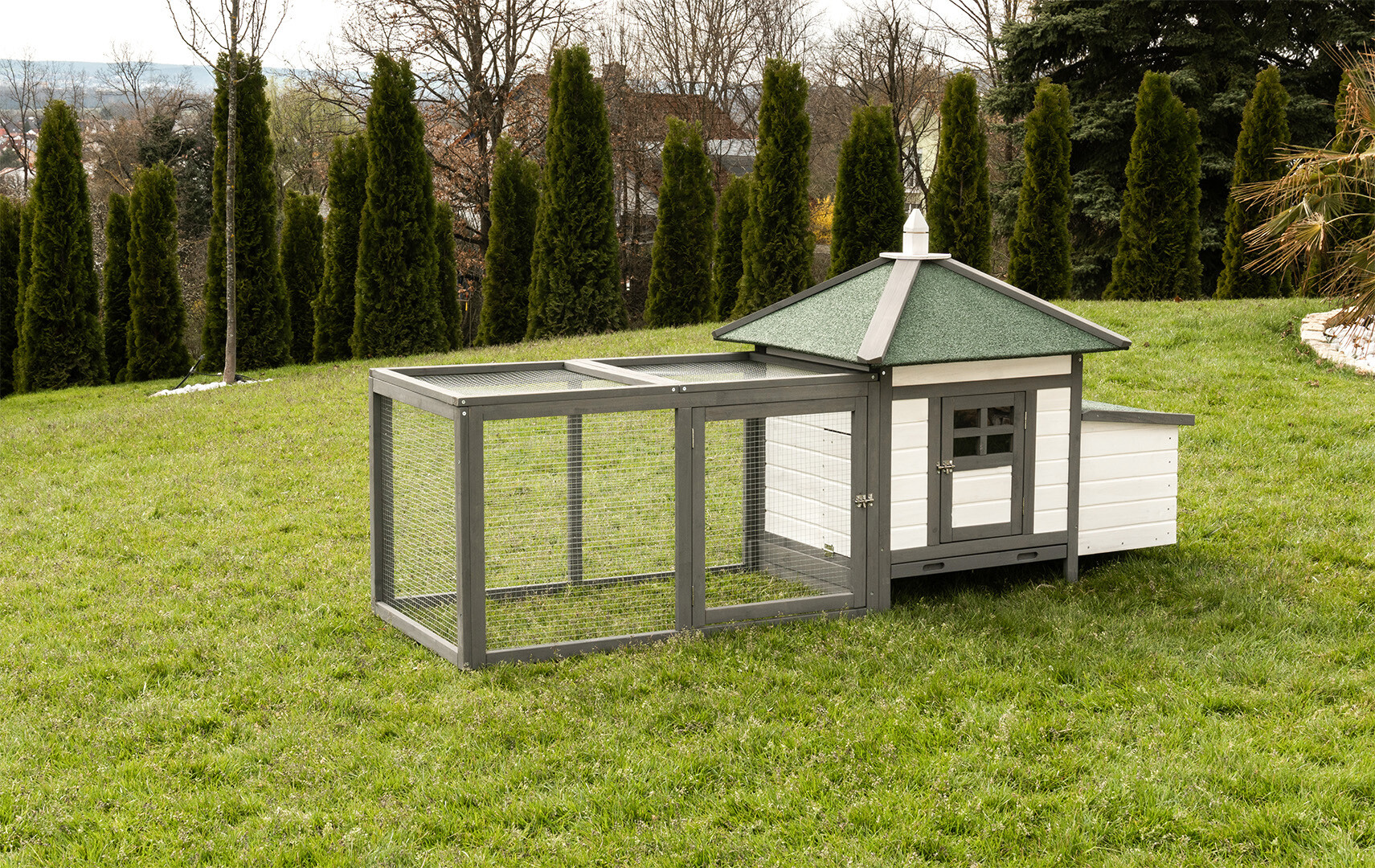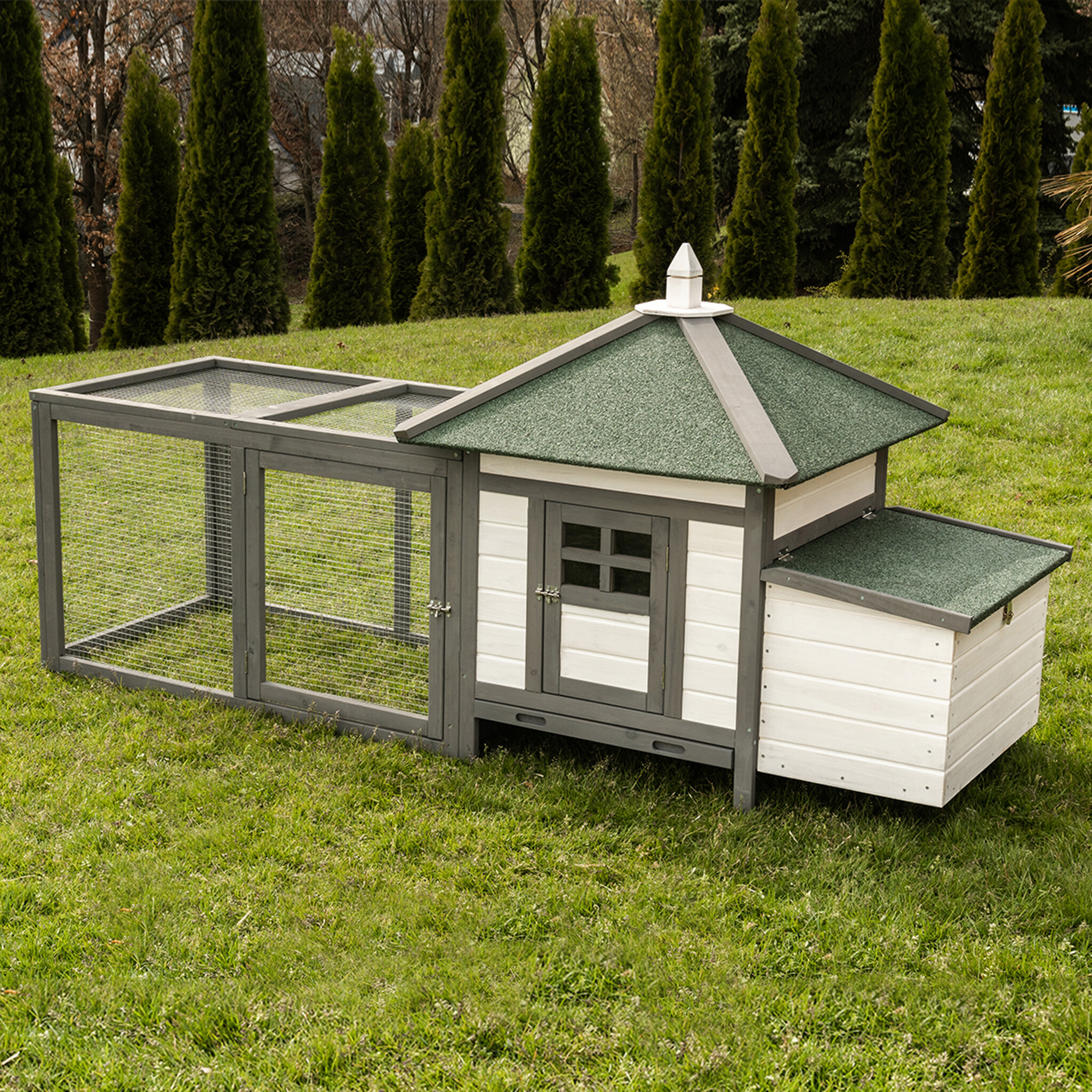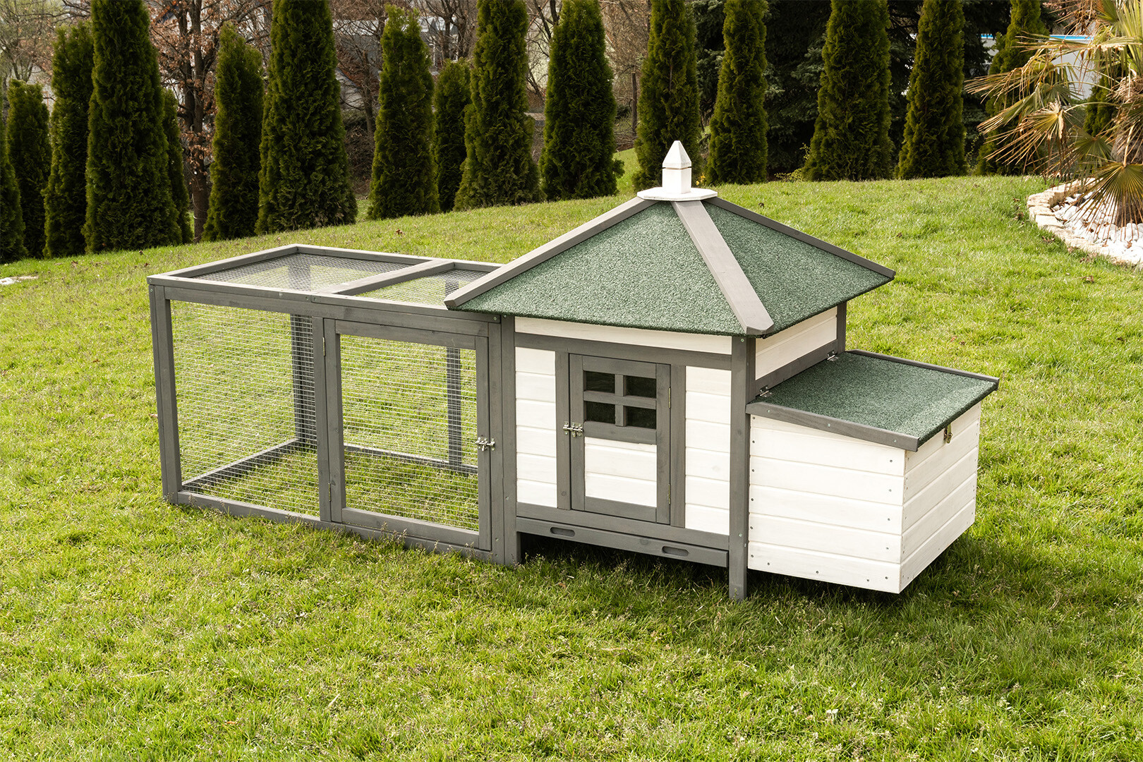 Model K200 to połączenie nowoczesnej estetyki z niezawodną trwałością. Dzięki zastosowaniu drewna olchowego wykończonego w stylowym, biało-szarym zestawieniu kolorystycznym, kurnik staje się nie tylko funkcjonalnym schronieniem, ale i prawdziwą ozdobą każdego ogrodu.