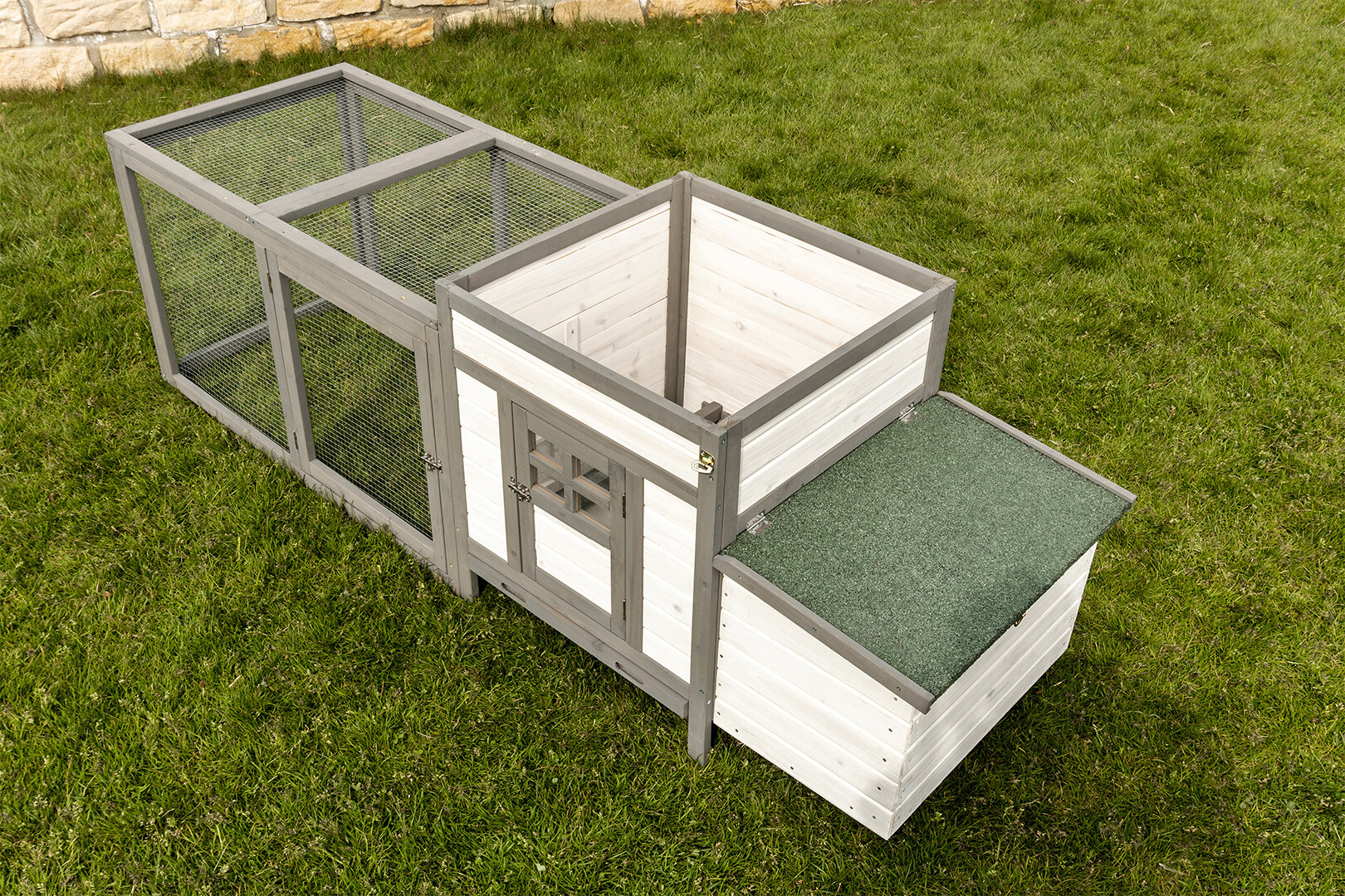 Swoboda ruchu: Wygodna rampa łączy bezpieczne piętro z przestronnym wybiegiem na świeżym powietrzu, pozwalając zwierzętom na aktywność w ciągu dnia.