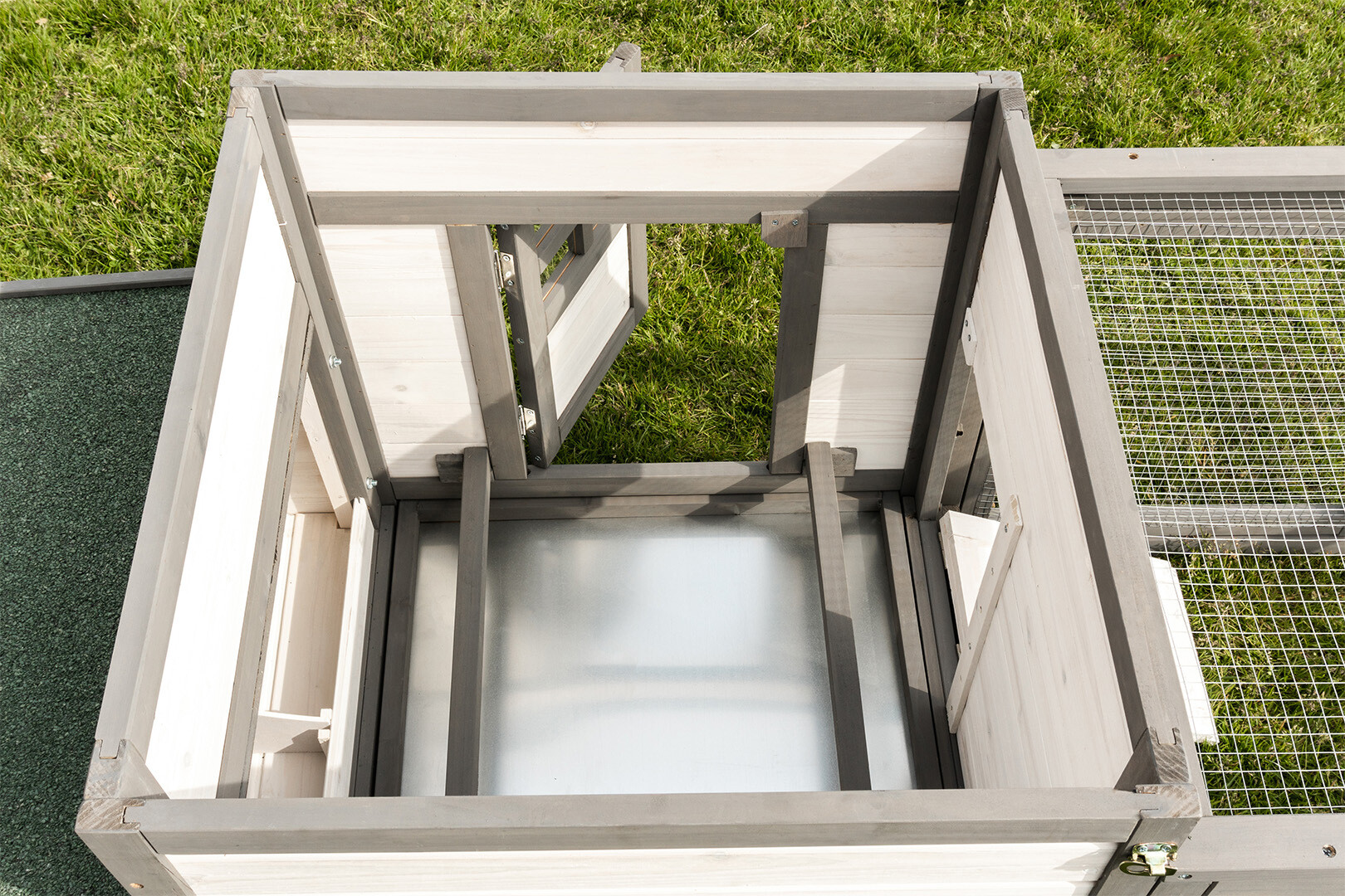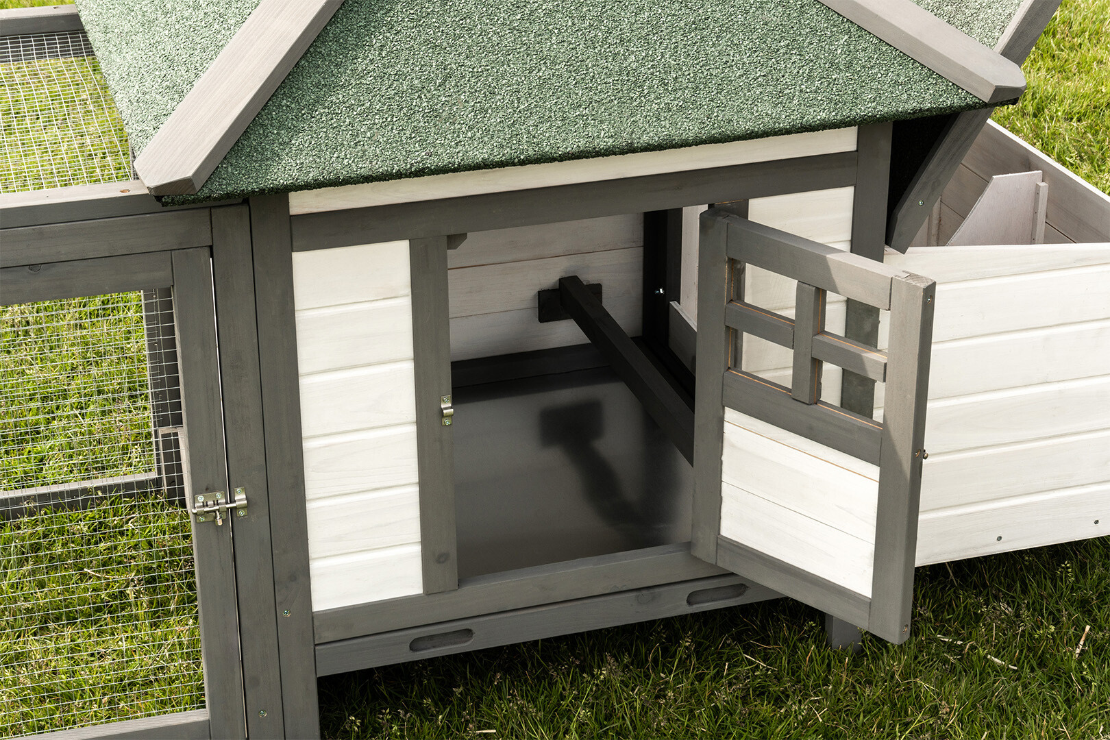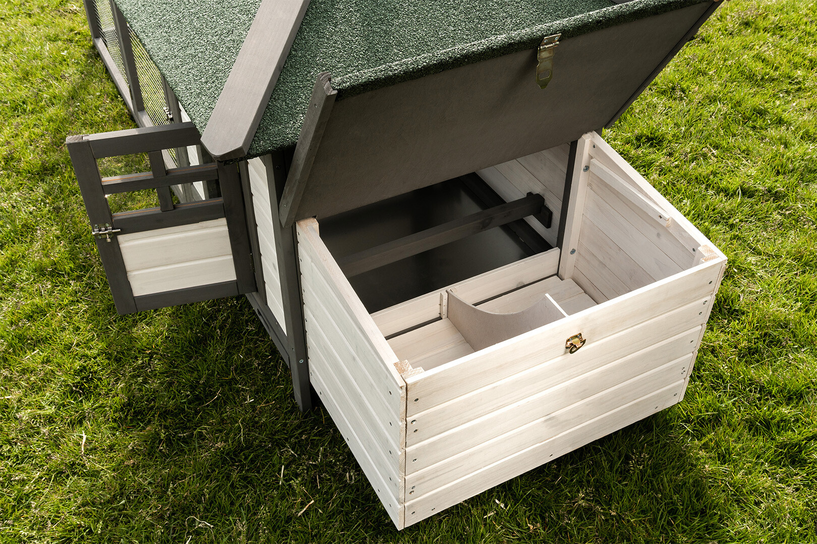 Łatwy zbiór jaj: Budka lęgowa z otwieranym od góry dachem umożliwia szybki dostęp do wnętrza bez niepokojenia zwierząt na wybiegu.