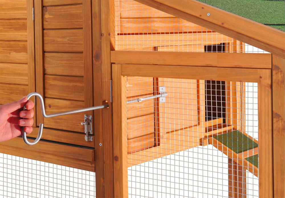 Zabezpieczenie: Wybieg osłonięty siatką o gęstym splocie (oczko 1,2 cm x 1,2 cm) i grubości drutu 0,7 mm, co stanowi skuteczną barierę przed gryzoniami i drapieżnikami.