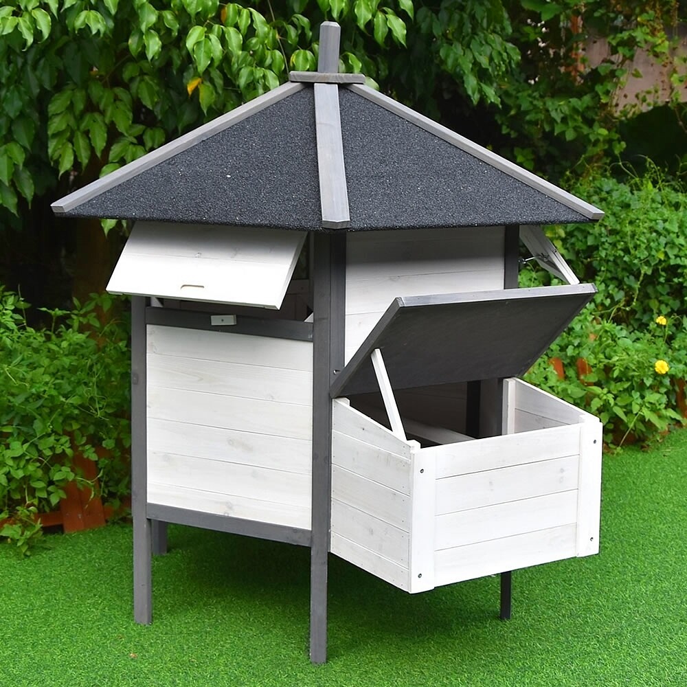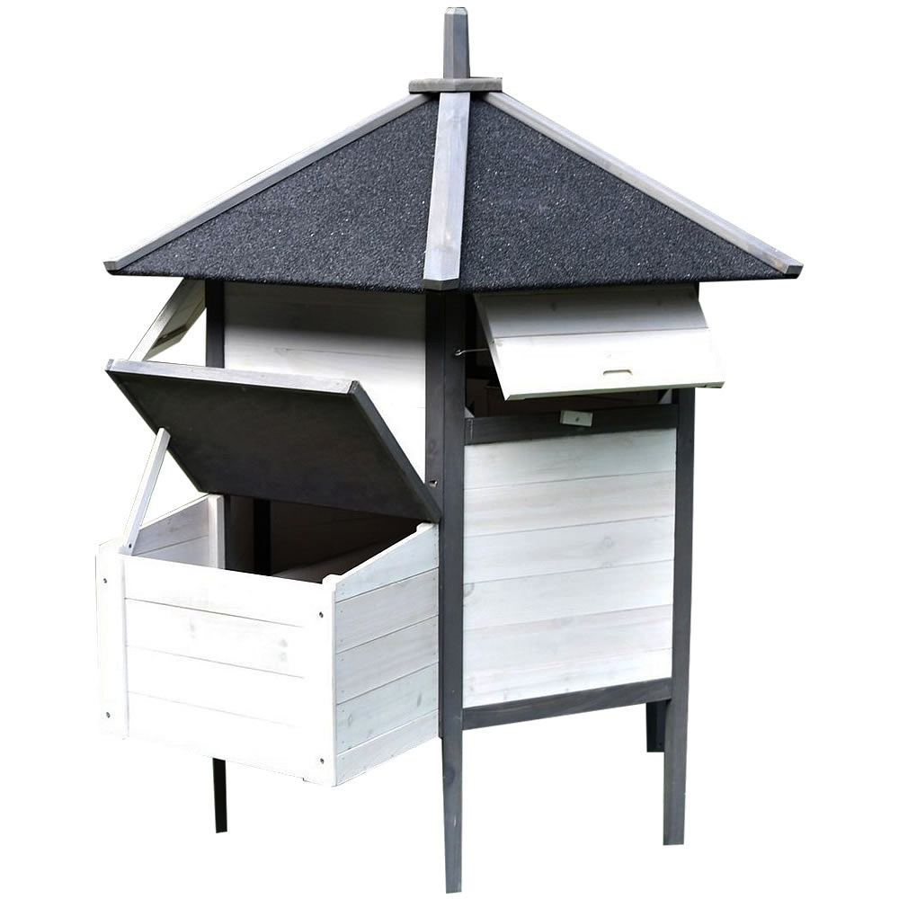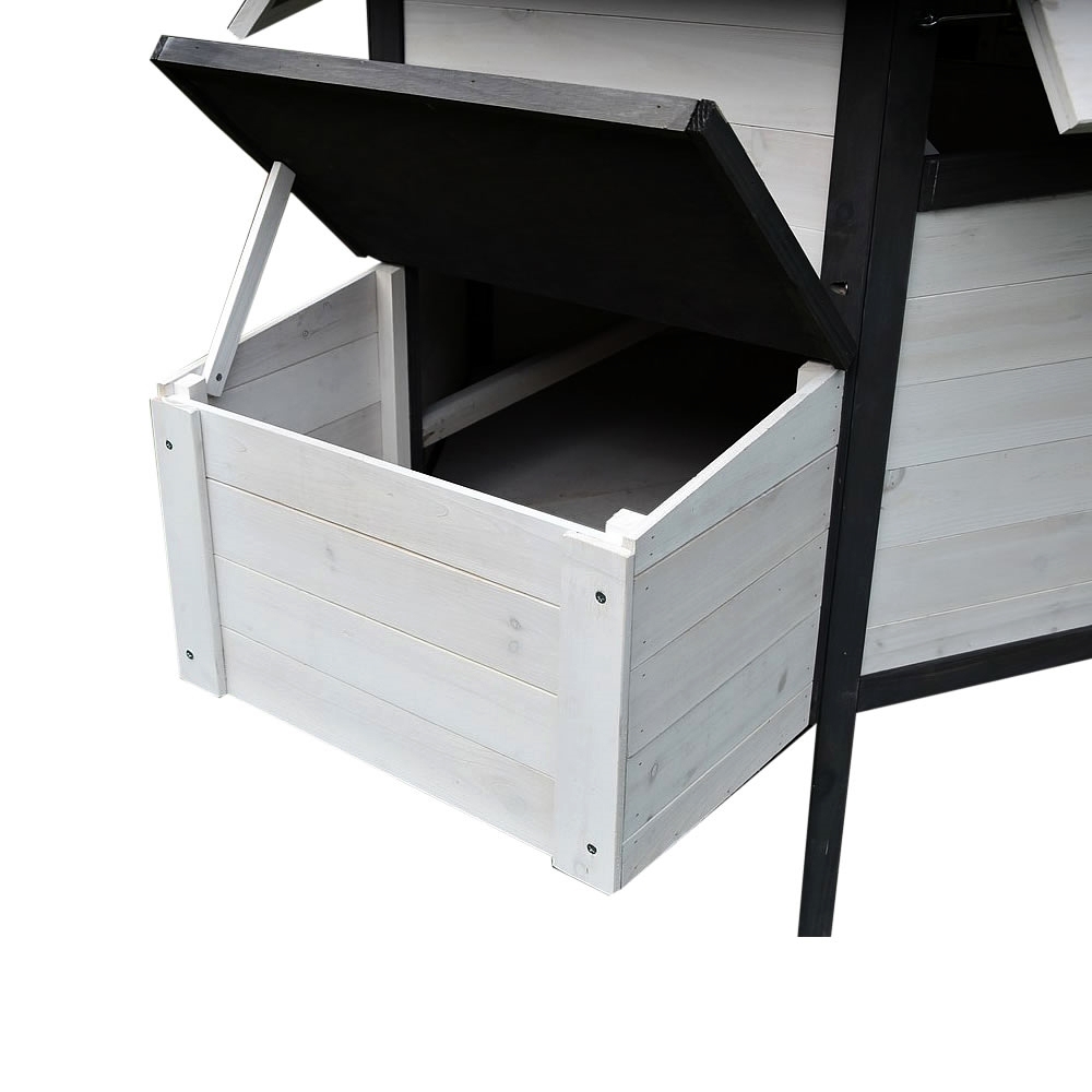 Dach kurnika oraz budki lęgowej został pokryty specjalną, wodoodporną izolacją, która chroni przed deszczem, śniegiem i gradem. Wykorzystanie wysokiej jakości drewna malowanego na nowoczesny kolor szaro-biały gwarantuje długą żywotność produktu i estetyczny wygląd przez lata.