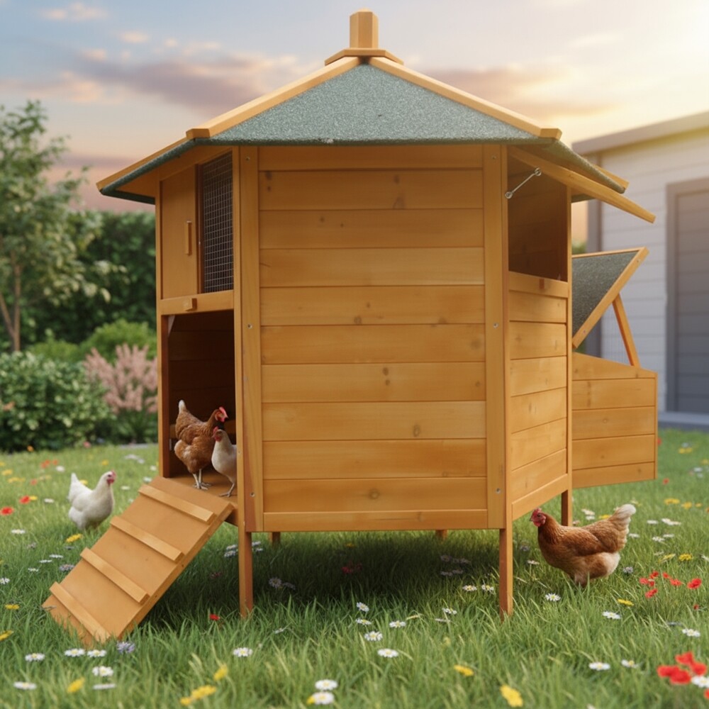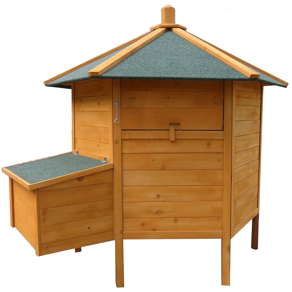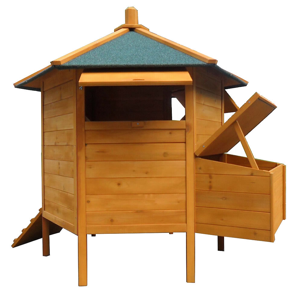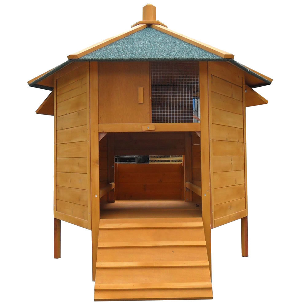 Solidna konstrukcja: Wykonany z wysokiej jakości drewna z wodoodpornym dachem. Izolacja od podłoża chroni kury przed zimnem i wilgocią.